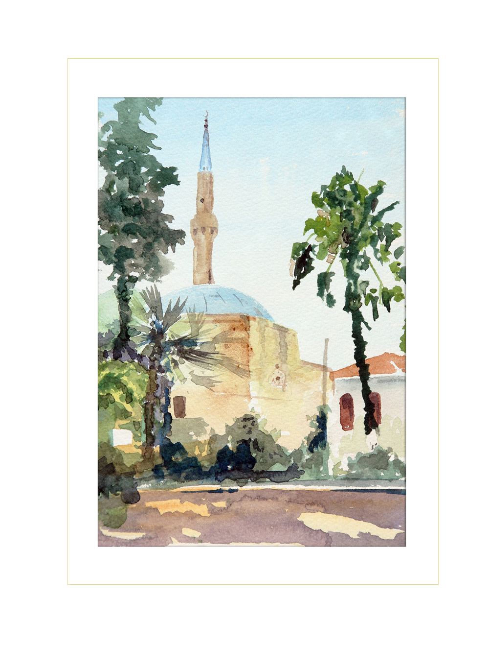 Shadows and translucent glass in the minaret’s point. Dalyan Mosque, Dalyan. Watercolour, 14x20cm