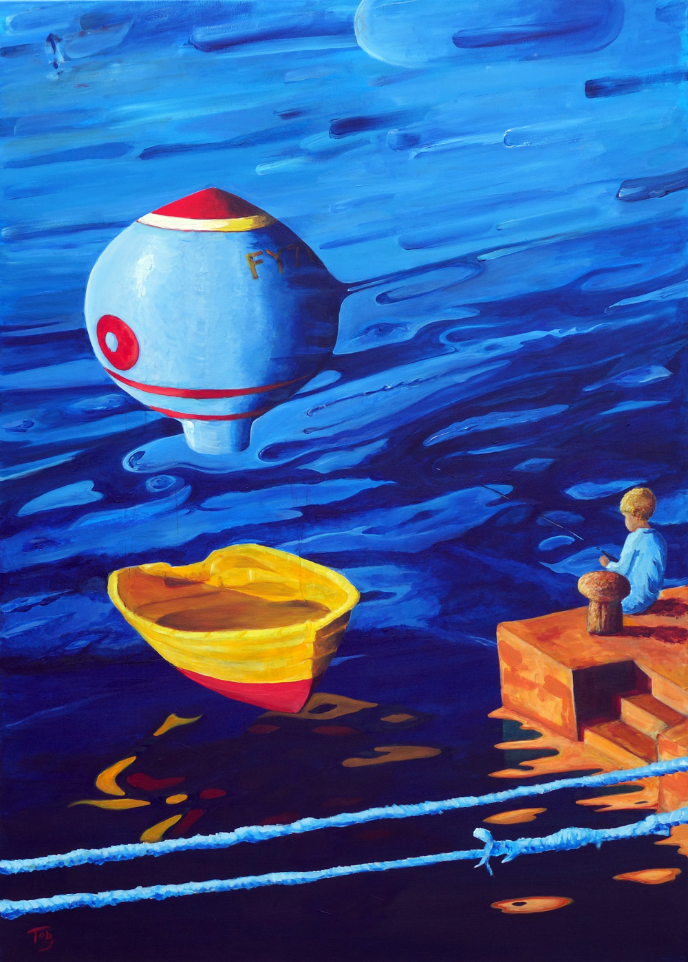 Daydream. Floating boat, melting harbour, cosmic sea. Surreal painting inspired by boats in Mevagissey harbour. Mevagissey, Cornwall. 2012. 100cm,140cm, Acrylic on Canvas.