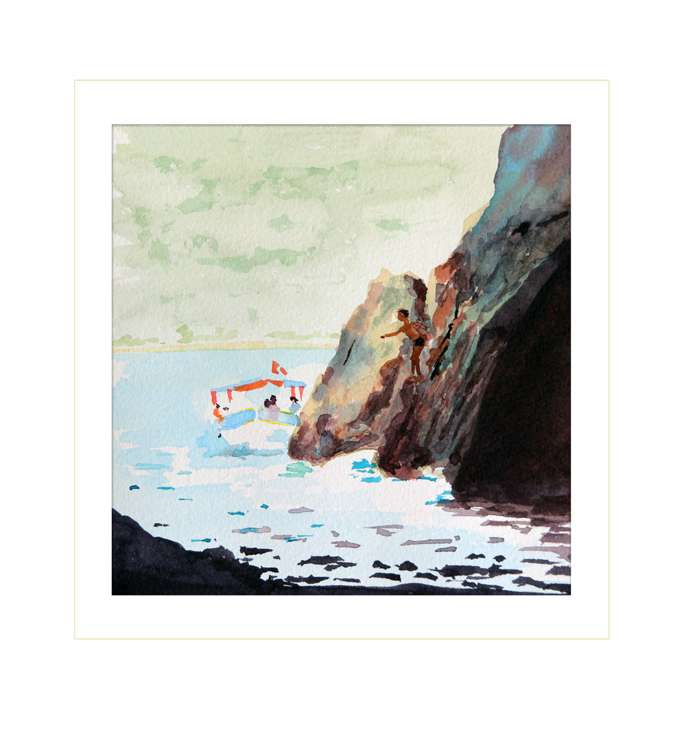 Jump, Blue Cave, Dalyan. Watercolour, 15x15cm