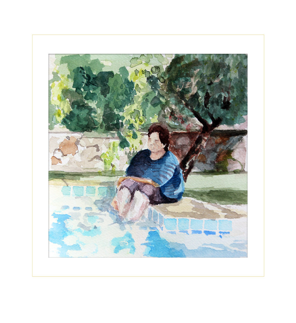 Nene Sitting by Pool (quick sketch), Dalyan. Watercolour, 15x15cm