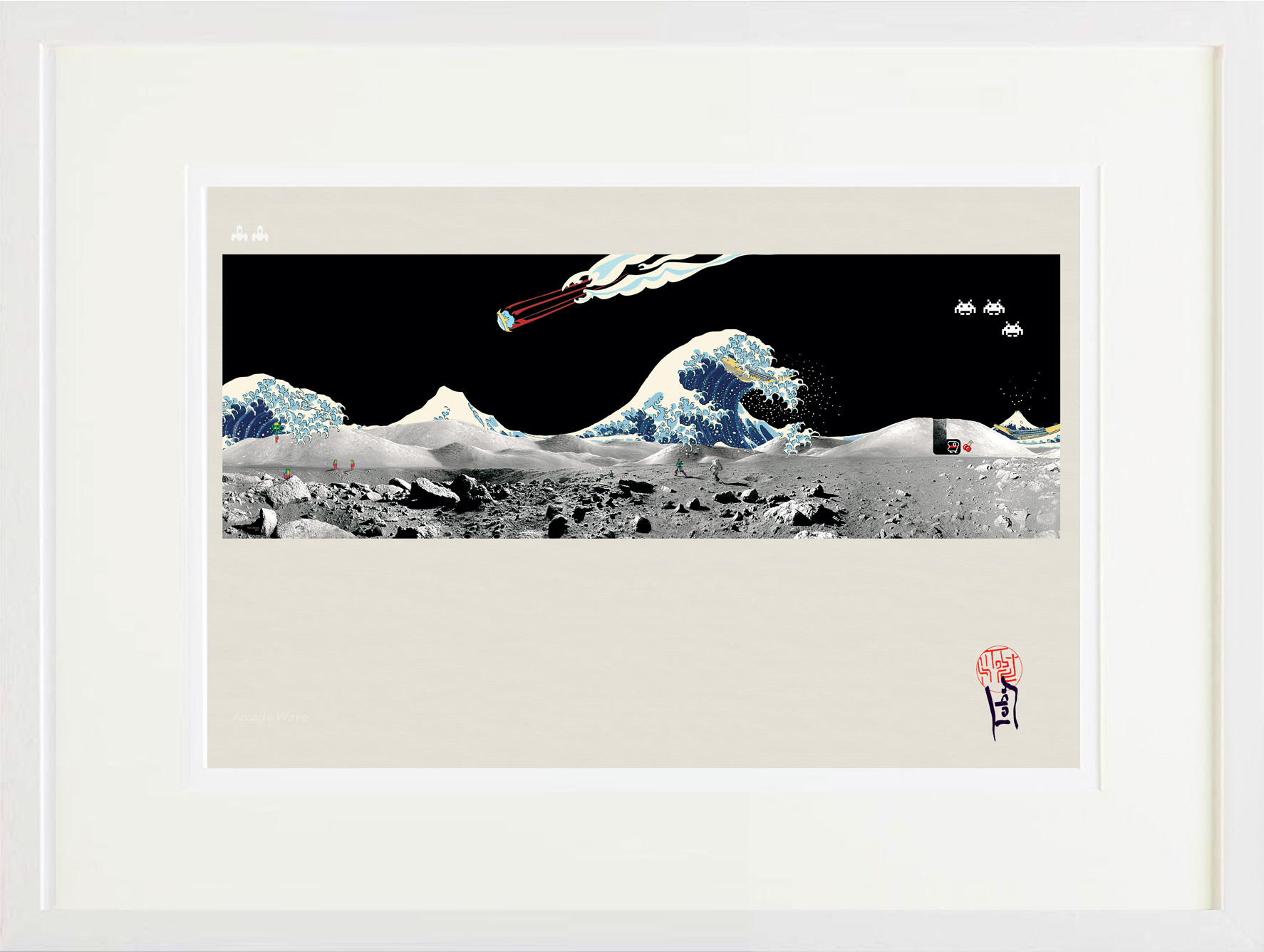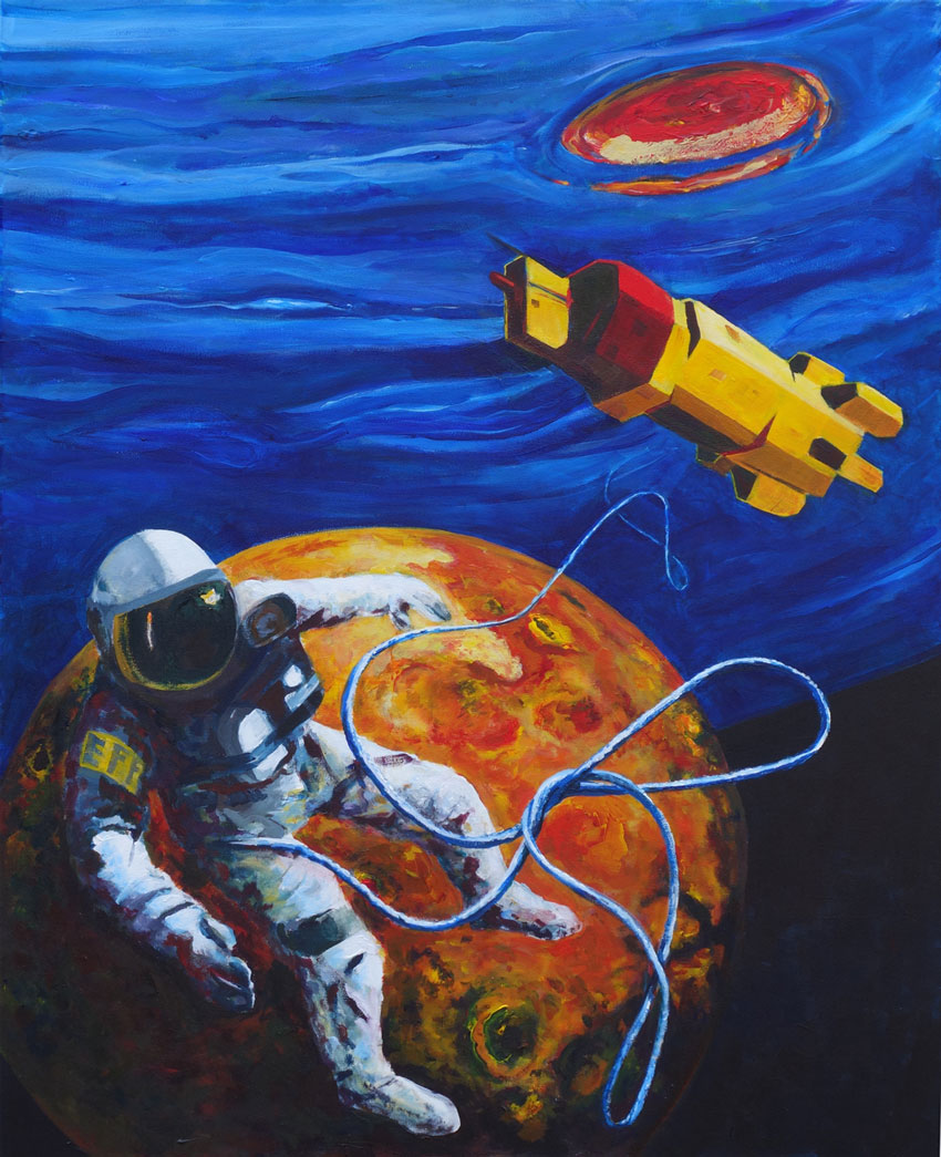 A strange fish swims beneath a strange alien sea. It jostles the photosynthetic spherules beneath its shattered reflection. This was one of my earlier paintings, I like its feel. Acrylic on Boar