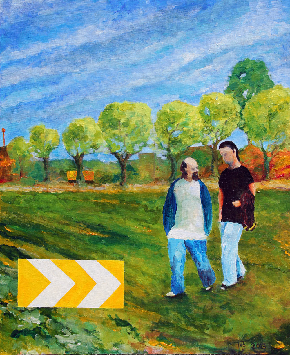 Just Two Guys, Amsterdam, Holland. Acrylic, 50x60cm Originally a detail from a larger painting. The personality of the guys kept changing as I painted until these two emerged. The lanky one is slow to
